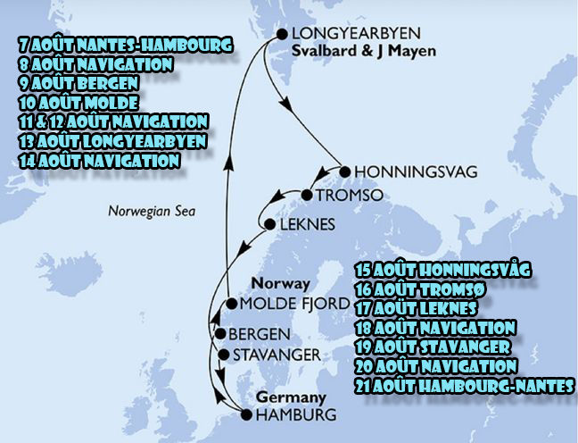 Nous voici donc repartis pour une escapade en Norvège, que nous avions déjà eu beaucoup de plaisir à découvrir en 2008. Notre croisière nous conduira notamment à Honninsvag implantée à proximité du cap nord et considérée comme la partie la plus septentrionale de l’Europe continentale et également jusqu’à Longyearbyen, cette minuscule ville située la plus au nord de la planète où la population vit à tout juste 1000 kilomètres du pôle nord ! Notre balade nous permettra également de découvrir plusieurs autres villes norvégiennes, remonter plusieurs fjords et vivre au rythme du soleil de minuit !