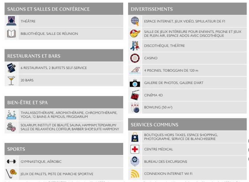 Tonnage : 139072 tonnes – Vitesse de Navigation : 24,21 nœuds – Nombre de Ponts : 18 don’t 13 accessibles aux passagers.